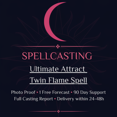 The Ultimate Attract Twin Flame Spell is a personalised ritual designed to draw your true soul counterpart closer while aligning your energy with deep spiritual connection and recognition. This work focuses on activating heart energy, removing internal and external blocks, and strengthening the vibrational pathway that supports meaningful union. It is suitable for those seeking to attract a destined partner, reconnect with a twin flame, or accelerate spiritual relationship alignment. The ritual is performed with focused intention to support harmony, growth, and mutual awakening while respecting natural timing and the highest good. Ideal for those longing for profound love, soul recognition, and transformative partnership.
